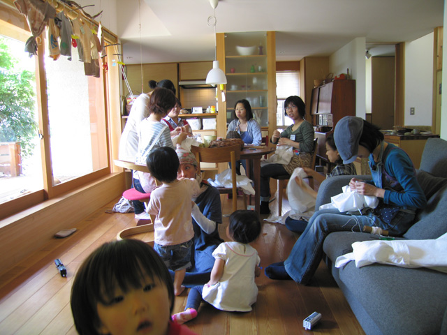 子供たちもふくめ、わきあいあいと風呂敷を染めました。