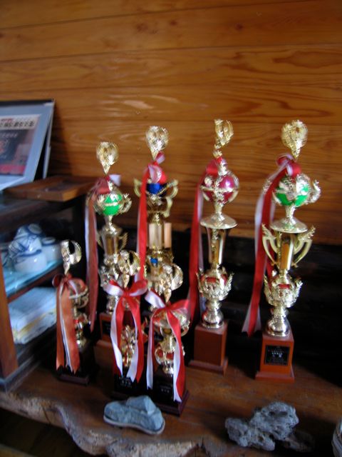 これ、まさおさんが民謡で獲得したトロフィーの数々です。